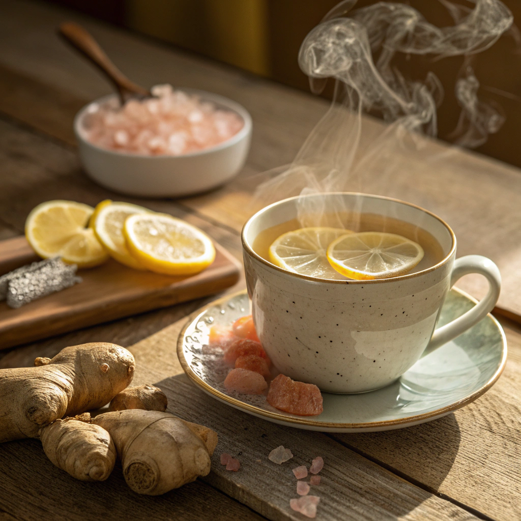 Steep grated ginger in hot water for 5 minutes. Strain, then add lemon juice and pink salt. Drink warm.