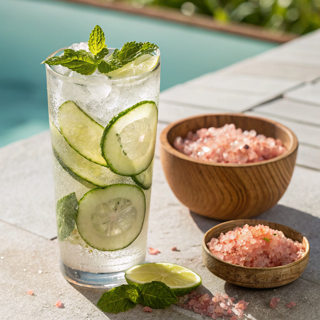 Muddle cucumber and mint slightly. Add water, lime juice, and pink salt. Stir and let sit for 5 minutes before drinking.